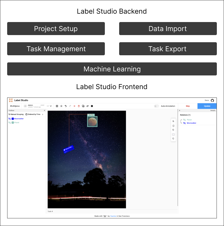 LS Frontend (LSF) with Backend (LSB) integration is similar what is described in the Frontend integration guide. The JavaScript integration script is placed in lsf-sdk.js in the Label Studio Backend. The main idea of this integration based on LSF callbacks.